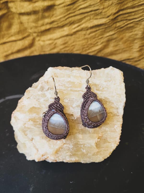Deux pierres jumelles en Opale Owyhee délicatement et élégamment tissées en micro-macramé
