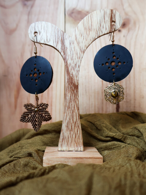D’un côté, la boucle d’oreille continue avec une feuille d’érable tissée à la main en micro-macramé.