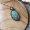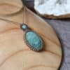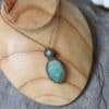 Collier en toute simplicité autour d’une jolie pierre nacrée d’amazonite. La perle est également en amazonite.