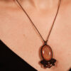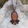 Un collier sautoir tissé à la main en micro-macramé autour d’une pierre d’aventurine orange.