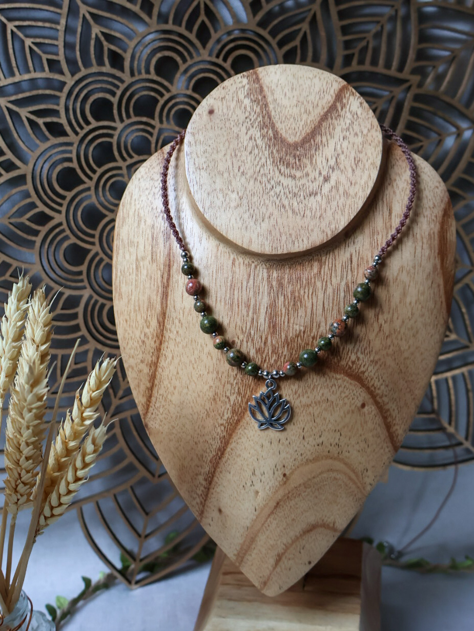 Collier lotus, perles d’unakite et d’acier inoxydable.