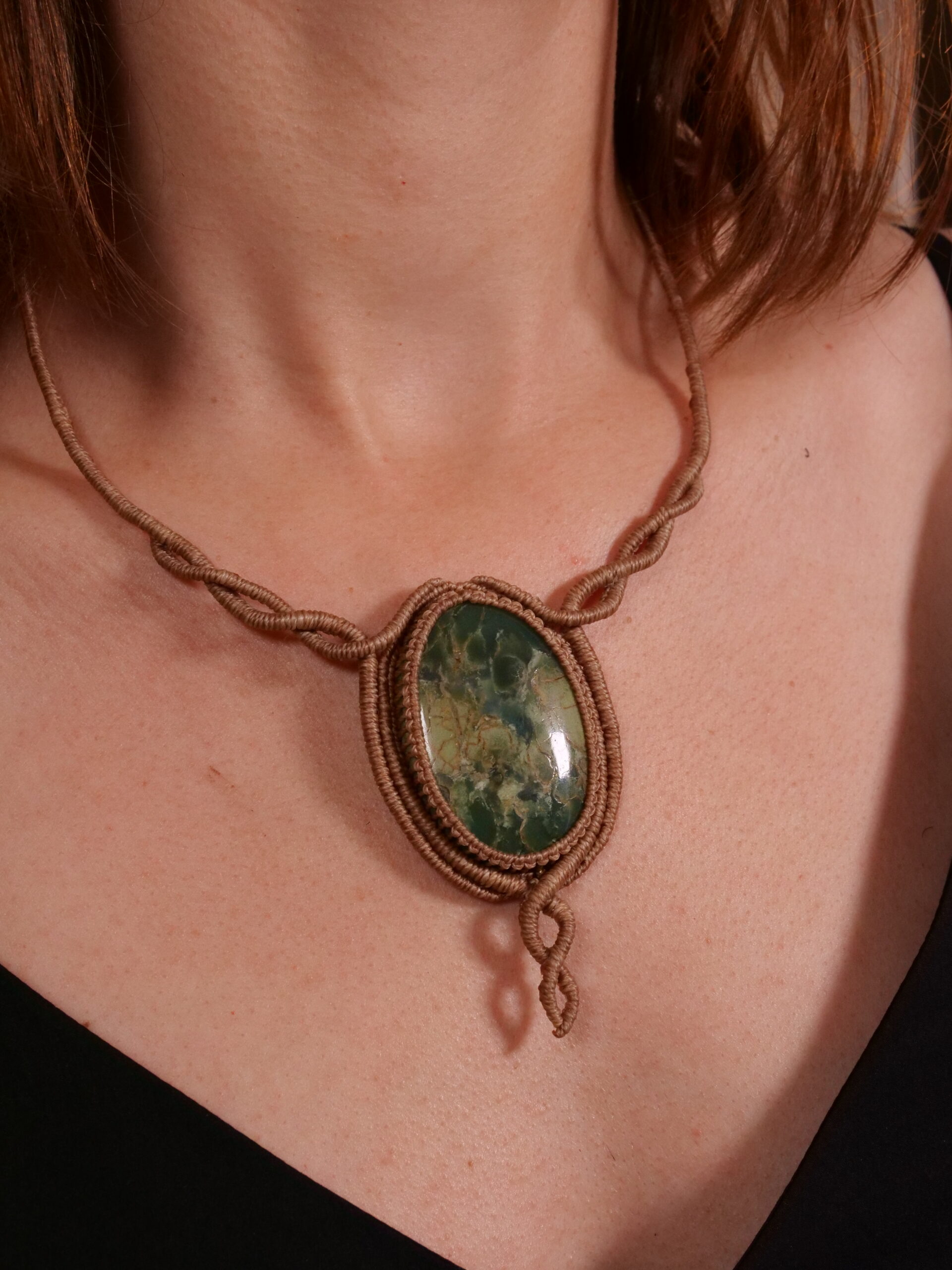 La chrysoprase, pierre d’ouverture et de régénération, repose dans un tissage aux tons paille, écho à la terre nourricière et à la lumière solaire.