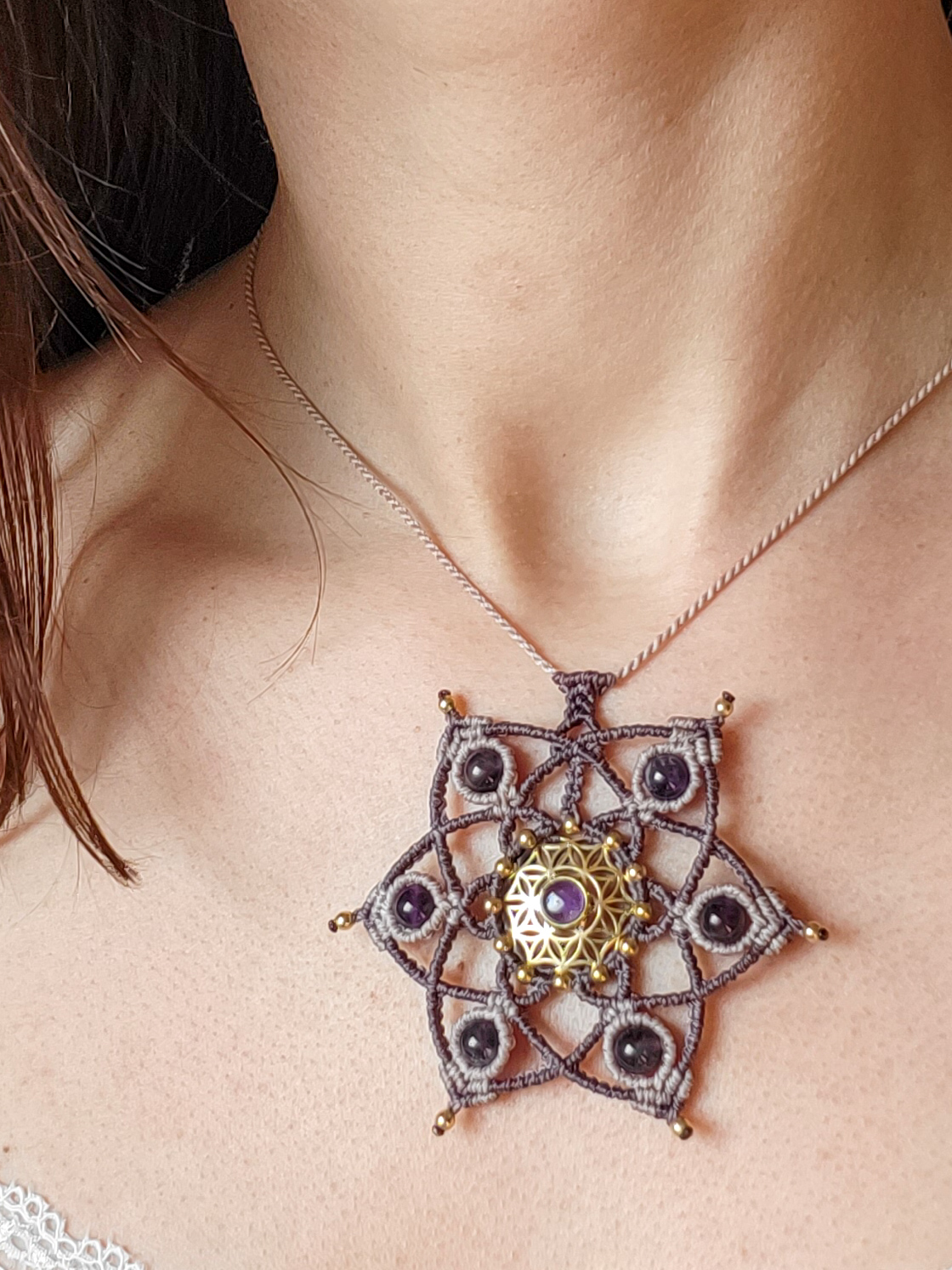 La fleur de vie est un symbole de renouvellement perpétuel. Le mandala tissé autour renforce la géométrie de la fleur de vie. L’améthyste, quant à elle, est une pierre d’ouverture à la spiritualité. Ce mandala bicolore représente à merveille le changement actuel que tu peux voir dans le monde :
