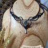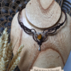 Le collier Marita se porte en ras de cou. En son centre, une estampe en laiton (doré ou argenté) surmontée d’une pierre.