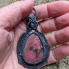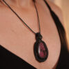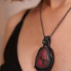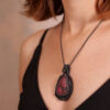 Un collier avec un pendentif en rhodonite serti en micro-macramé avec du fil couleur charbon.